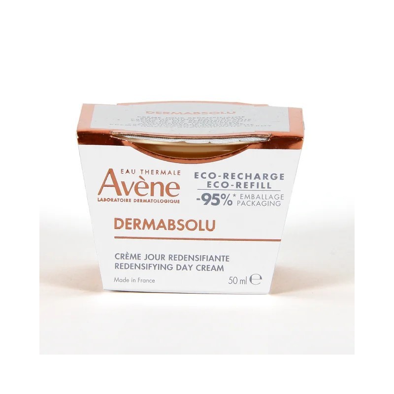 Avene dermabsolu eco-recarga crema de día ahora en formato recarga para que puedas reciclar tu producto. Contiene polifenoles de vainilla, sytenol™ y glicoleol, es un tratamiento redensificante y reafirmante que nutre, revitaliza e ilumina el rostro. Combate la flacidez y ralentiza el cronoenvejecimiento, está especialmente indicada en pieles maduras. Ilumina el rostro gracias a su efecto "tone up" y su textura aterciopelada deja un acabado sedoso y nutritivo.
